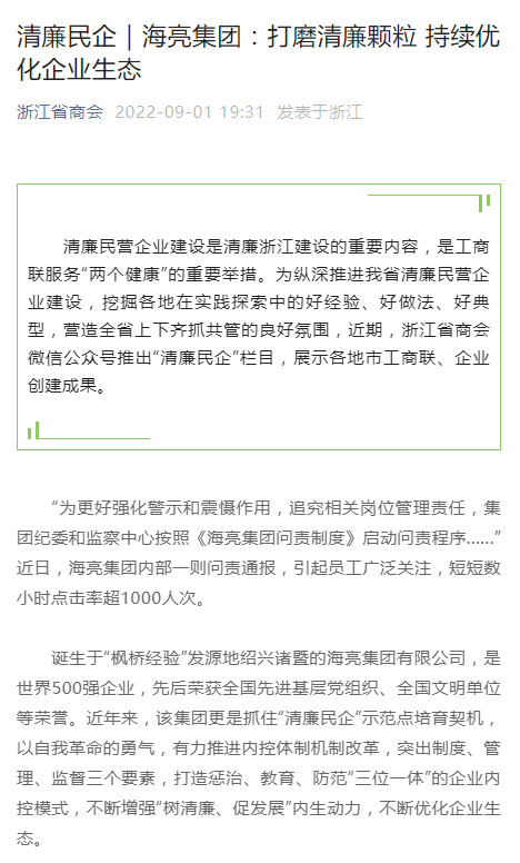 9月1日,浙江省商會“清廉民企”專欄以《海亮集團:打磨清廉顆粒 持續(xù)優(yōu)化企業(yè)生態(tài)》為題,報道海亮集團企業(yè)清廉建設(shè)經(jīng)驗,世界浙商網(wǎng)等媒體平臺轉(zhuǎn)載。