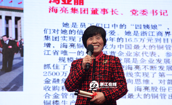 她是員工們口中的“四姨娘”,親切的稱呼透露出員工們對她的信任和喜愛。她是浙江商界的“奇女子”,帶領(lǐng)海亮集團實現(xiàn)了從1989年的16.5萬元到目前的344.51億元的資產(chǎn)遞增。2012年,她作為浙江省唯一的一位民營企業(yè)家代表,參加了黨的十八大。