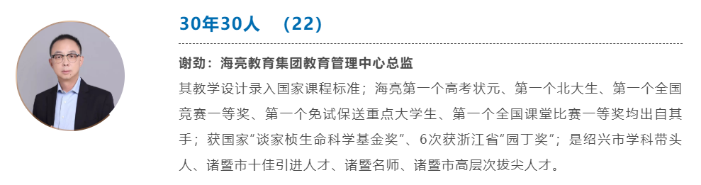 教學設計選入國家教育部新《課程標準》,是迄今為止海亮教育的唯一;海亮教育歷史上獲全國課堂教學比賽一等獎的第一人;國家“談家楨生命科學基金獎”獲得者;6次獲得浙江省“園丁獎”;海亮教育制度體系和學校文化的主要設計者之一……他鉆研的腳步從不曾停止。